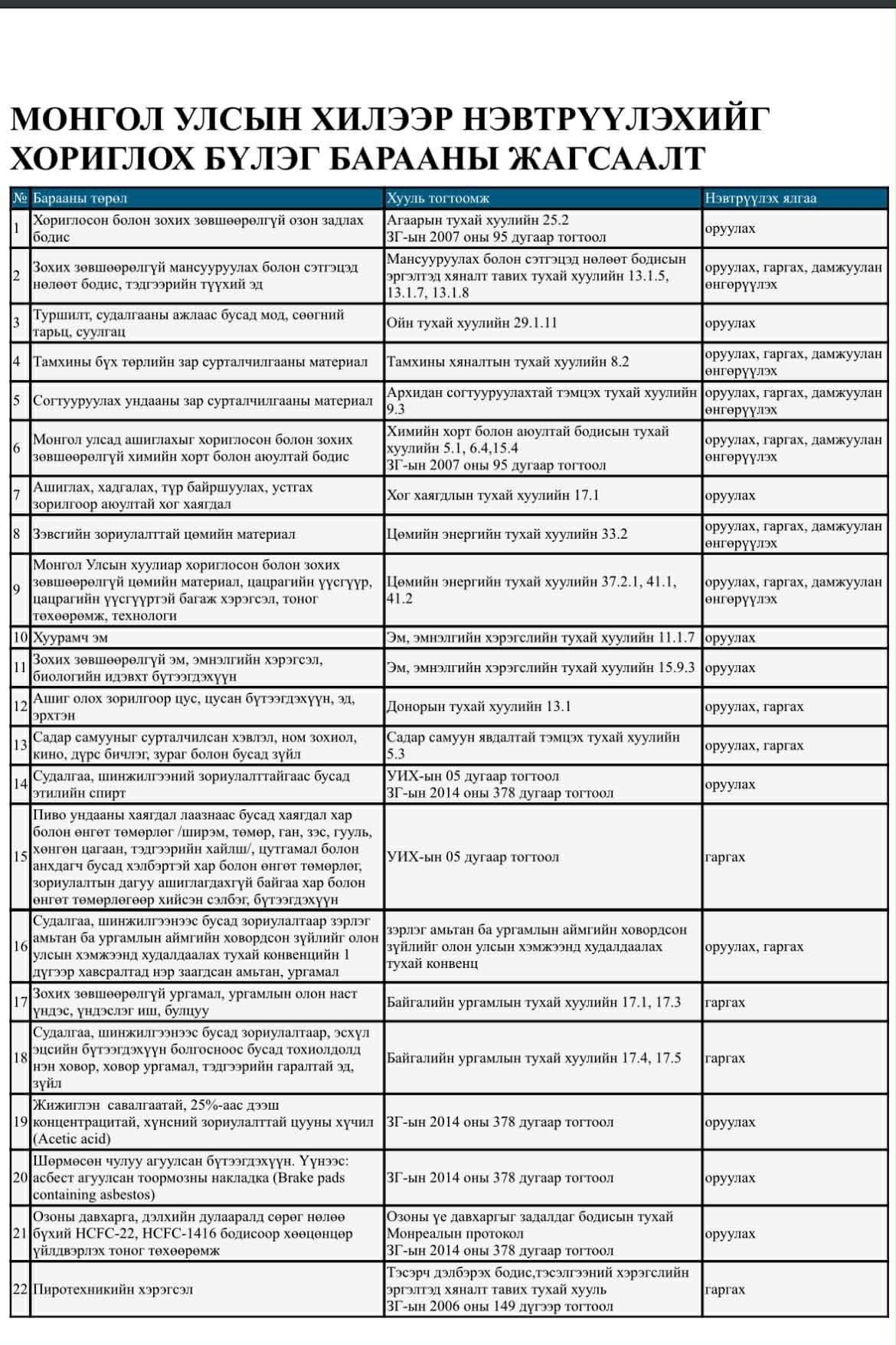 МОНГОЛ УЛСЫН ГААЛИЙН ТУХАЙ ХУУЛЬД ТУСГАСАН ХОРИОТОЙ БҮХ ТӨРЛИЙН БАРАА